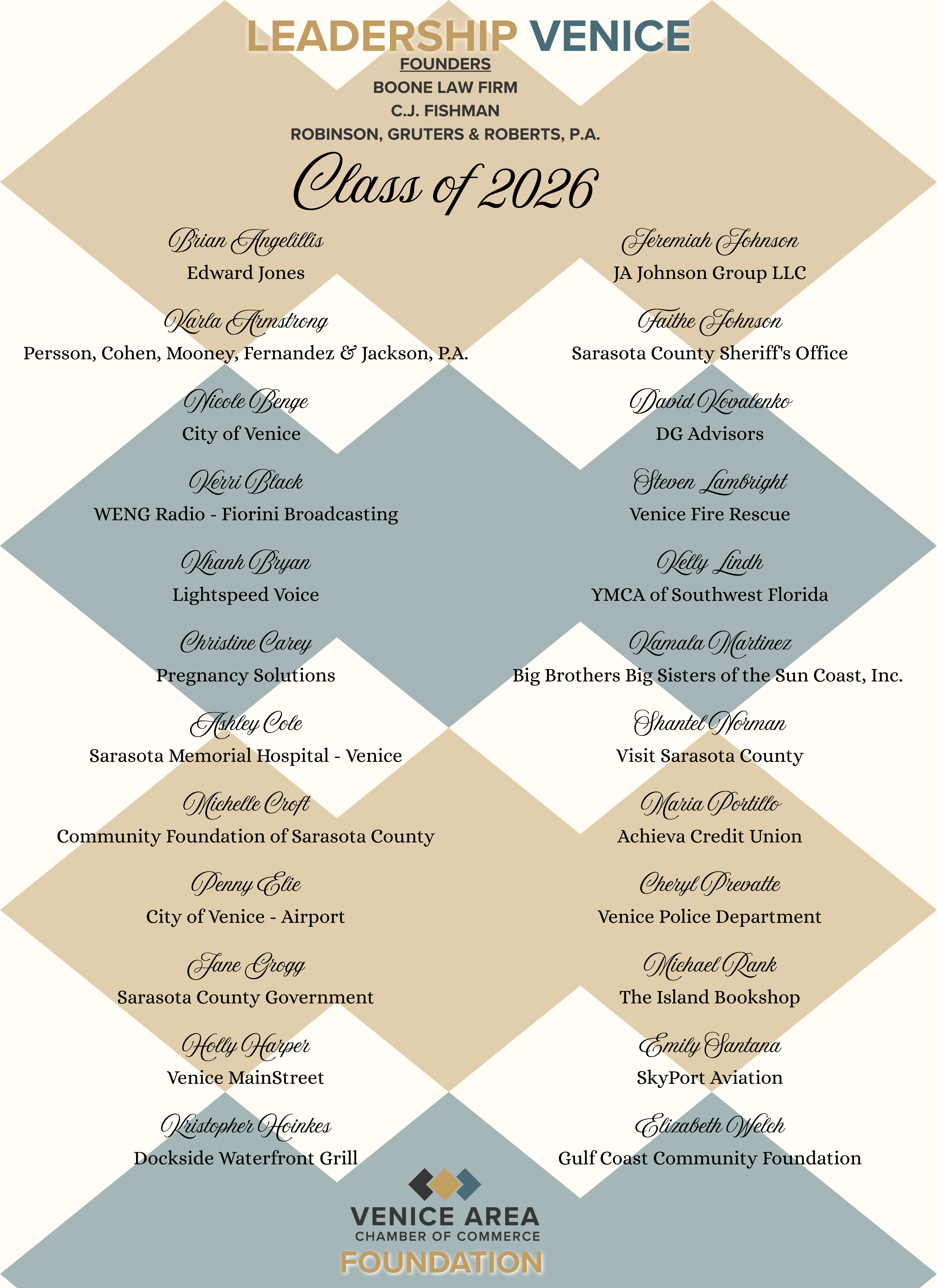 The Venice Area Chamber of Commerce Foundation (501)(c)(3) affiliate of the Venice Area Chamber of Commerce (VACC) was established for the aims of advancement and diffusion of knowledge and understanding of economics, matters of public concern, finance, education and training, housing, human relations, problems of minority groups, science and technology, economic planning and development, international relations, and other subjects related to improved efficiency, development, and acceleration of both the quality and quantity of economic growth and employment opportunities. *Excerpt from VACC Foundation Bylaws.